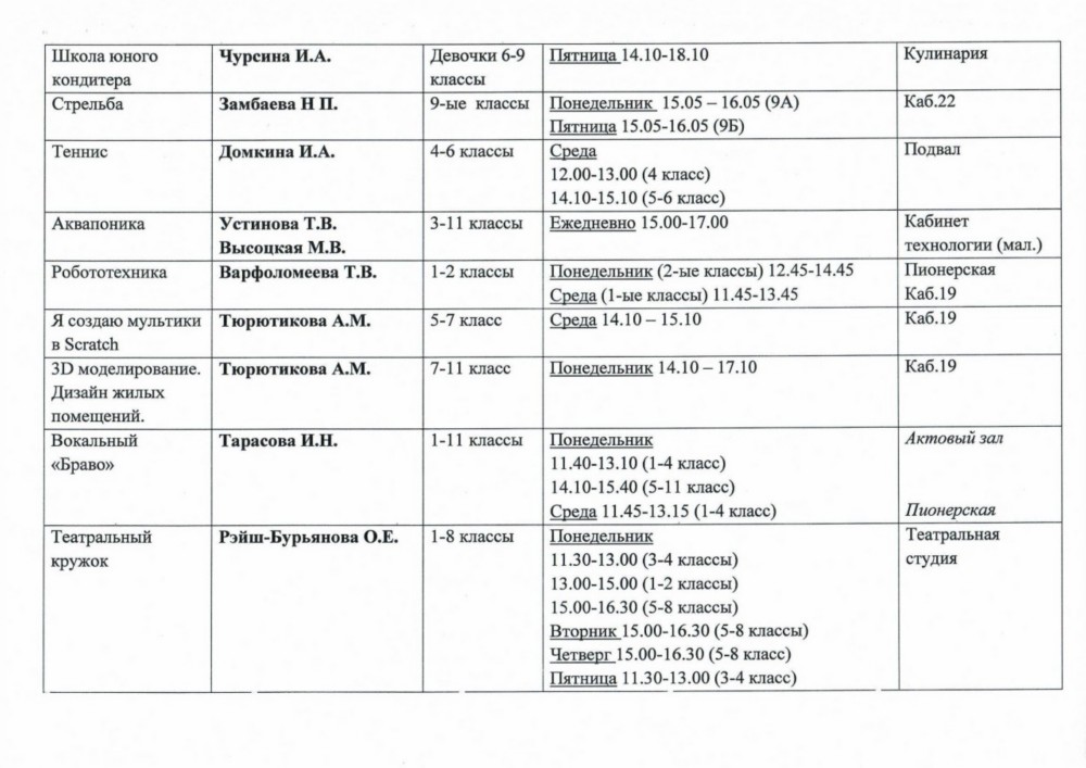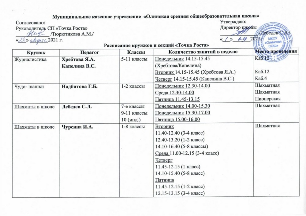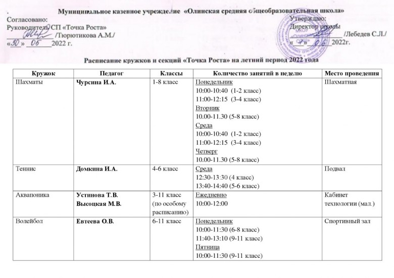 Расписание кружков и секций центра "Точка Роста" на летний период 2022 г.